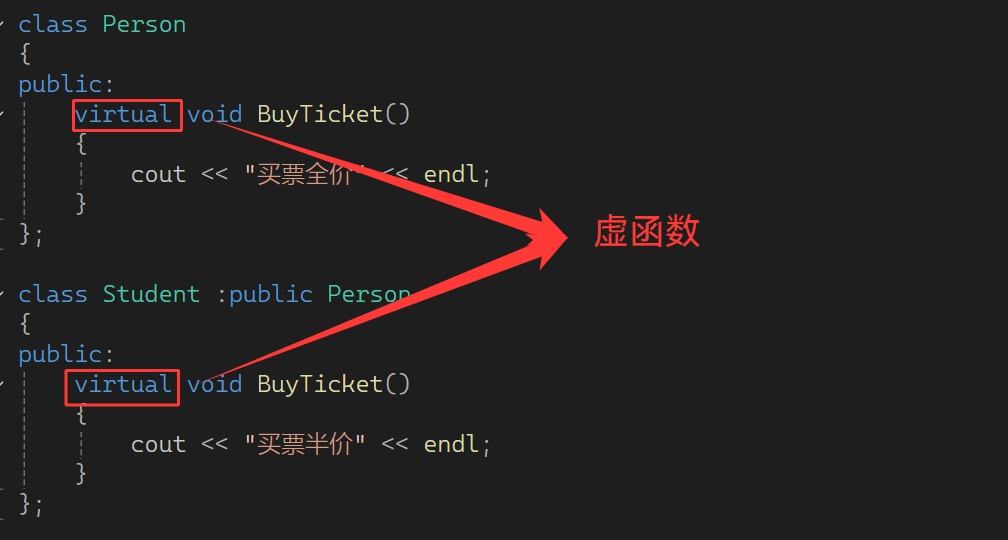比如说上面代码中Person类和Student类中的 BuyTicket 函数 , 函数返回值之前都加了关键字 virtual , 所以这两个函数都构成虚函数: