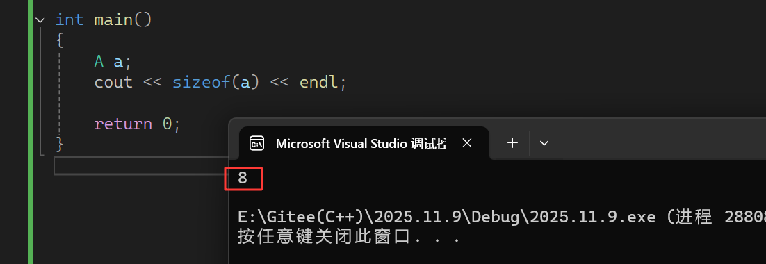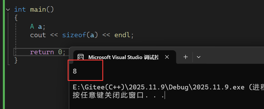 - 这里为什么运行结果是8字节呢?,不是类实例化出的对象的大小只跟成员变量有关吗?a对象的中的成员变量只有一个_a,为什么不是4字节呢?接下来请继续向下阅读