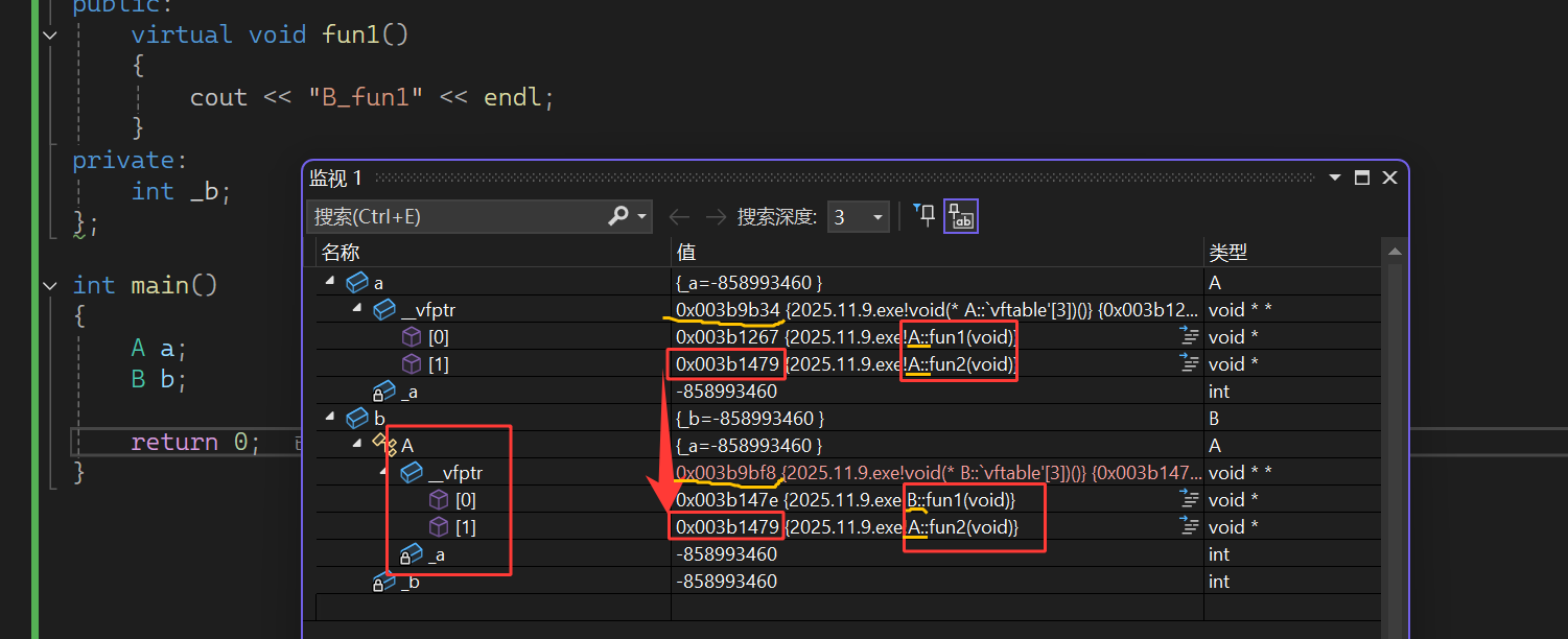 - 基类对象a和派生类对象b的虚表是不一样的,派生类对象b完成了对虚函数fun1的重写,所以b对象的虚表中存储的是B::fun1(void),所以虚函数的重写也叫做覆盖,覆盖指的是虚表中虚函数的覆盖。重写是语法的叫法,覆盖是原理的叫法