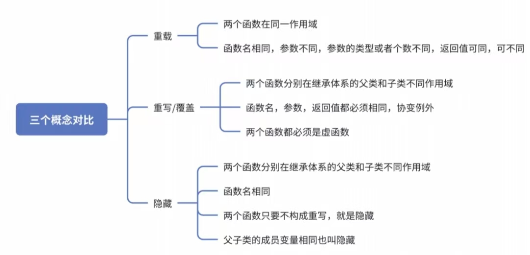 - 虚函数的重写是语法层的概念,在原理层上又称覆盖。这里重写的是虚函数的实现,继承的是虚函数接口,如果把函数的声明比作壳,函数的实现比作核,那么派生类继承的是壳即声明,重写的是核即实现