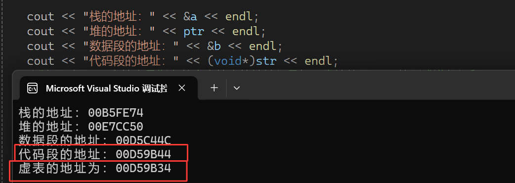{int a = 0; //普通的变量存储在栈上int* ptr = new int;//动态开辟是在堆上static int b = 0; //静态变量存储在数据段(静态区)const char* str = "hello cpp";//常量字符串是在代码段(常量区)cout << "栈的地址:" << &a << endl;cout << "堆的地址:" << ptr << endl;cout << "数据段的地址:" << &b << endl;cout << "代码段的地址:" << (void*)str << endl;//这里对于str字符串是指向首个字符串的地址但是如果直接使用cout的形式进行打印//那么会被cout识别为字符串进行打印,这时候我们进行强制类型转换为void*的指针//这时候使用cout进行打印那么打印的就为常量字符串的地址了A c;cout << "虚表的地址为:" << (void*)*((int*)&c) << endl;//虚表即为虚函数表,虚函数表的地址就是在对象c的虚函数表指针,虚函数表指针在//vs中是指针,x86的环境32位为4个字节,整形恰好为4个字节,由于虚函数表指针//和对象c中的其它成员变量是依次存储的,并且虚函数表指针(虚表指针)存储到对//象c的存储空间的最开始的位置上,由于虚表指针为4个字节,那么我们取出对象c的//地址将其强转为int*的类型,那么就可以借助整形指针去访问4个字节的空间,我们//知道指针的类型影响的是指针访问的范围,如果是char*的指针访问的就为1个字节,//如果为int*的指针那么访问空间的大小范围就为4个字节,那么就可以借助整形指针//访问对象c的前4个字节的,即此时int*的指针就指向的是对象c的前4个字节,即int*//的指针就为对象c的前4个字节的地址,此时进行对整形指针进行解引用就可以拿到//对象c的前四个字节存放的虚表指针的数据,由于是采用整形指针解引用访问的虚表//指针的数据,所以这个数据就不是指针类型的了,而是int类型的,如果此时直接对//这个int类型的数据进行打印,那么我们打印的是10进制的数据和地址的16进制不符//,那么我们将其强转为void*的指针类型即可,此时进行打印就为无符号指针的类型//即打印出了虚表指针return 0;