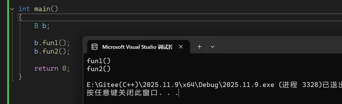 public:virtual void fun1(){cout << "A_fun1()" << endl;}virtual void fun2(){cout << "B_fun2()" << endl;}private:int _a;