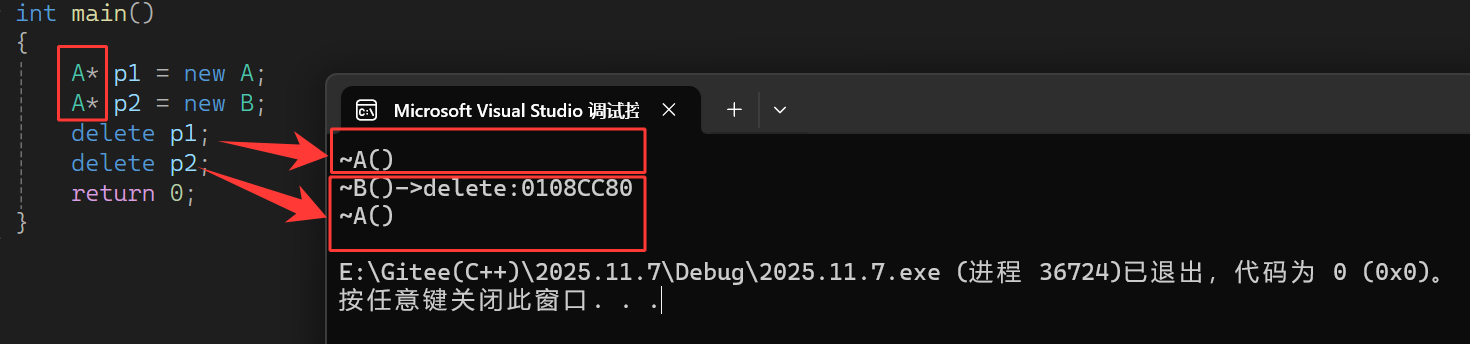 {A* p1 = new A;A* p2 = new B;delete p1;delete p2;return 0;