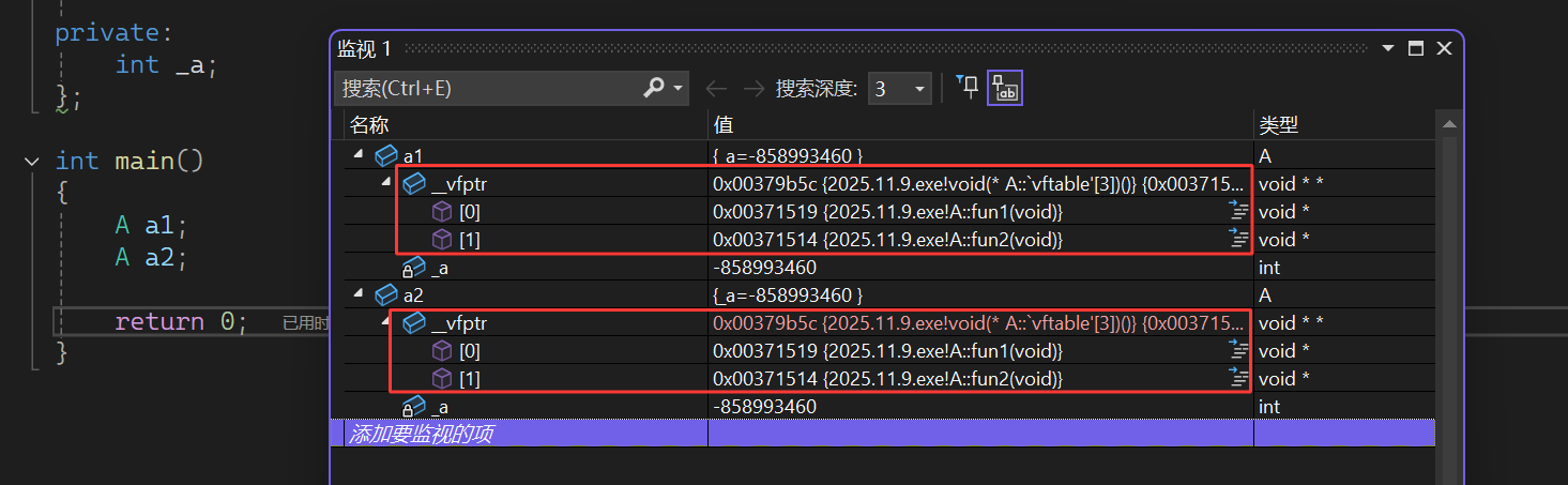 - a1和a2的类型相同都为A类,此时这张虚表对于A类实例化出的全部对象都是通用的,a1对象和a2对象的虚表指针相同,虚表的内容也完全相同