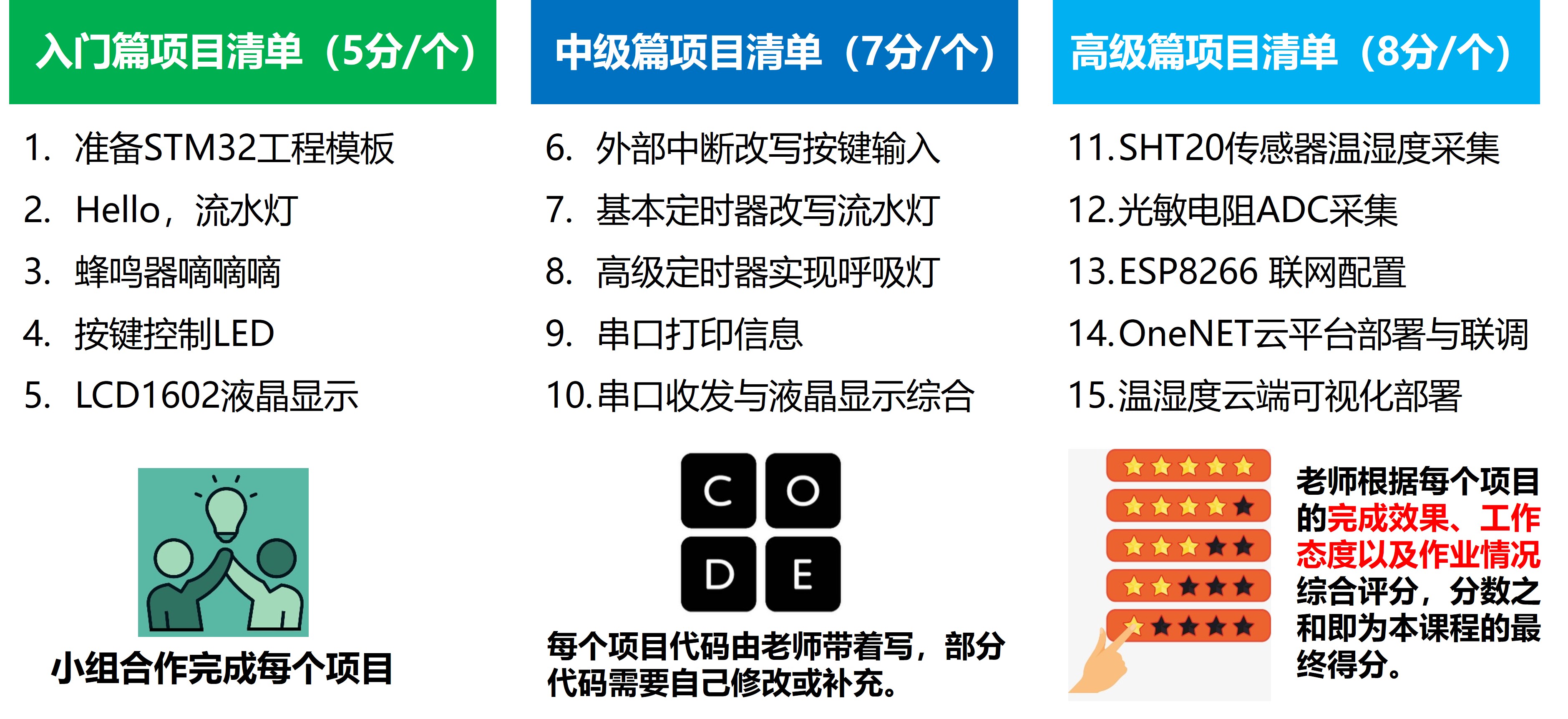新学期,又要给学生上 STM32 嵌入式课程了。这课上了多年了,一直用的都是标准库来开发,已经驾轻就熟了。人就是这样,有了自己熟悉的舒适圈,就很难做出改变,老师上课也是如此,排斥新课和不熟悉的内容。显然,STM32 的开发,HAL 库已是主流,自己其实也在使用,只不过更换库就意味着教学内容有很大变化,自己也就迟迟没有迈出调整这一步。现在,是时候做出变化了,笔者计划保持教学项目不变(图 1 所示),逐步将源码替换成 HAL 库。虽然不能一步到位,但会在备课期间逐步替换,自己就当再学习和巩固一遍。