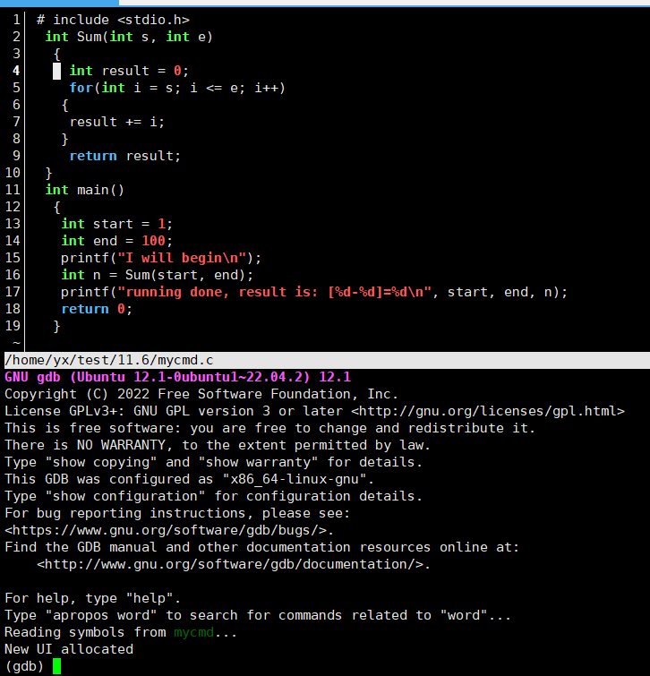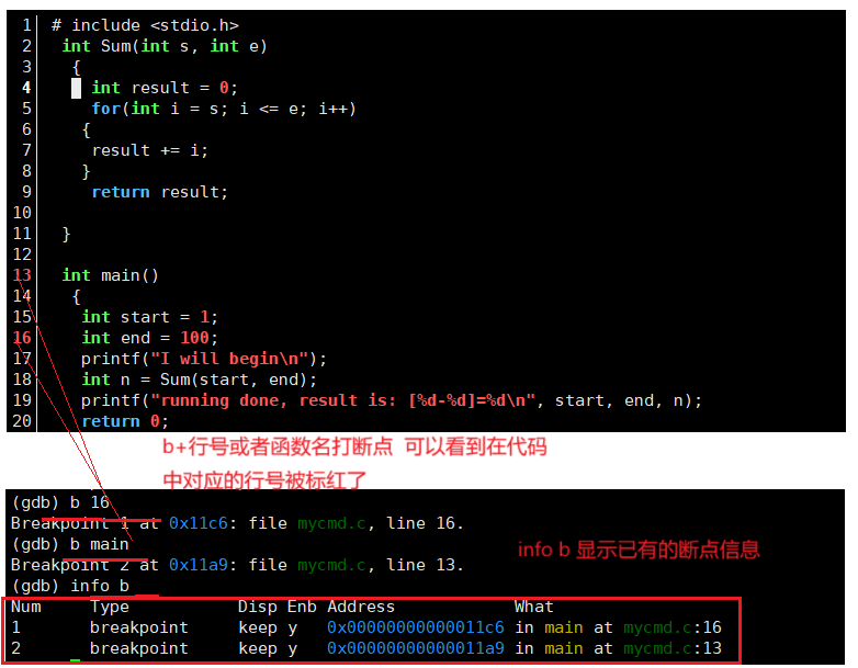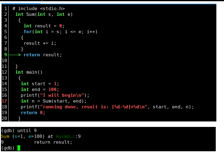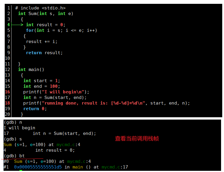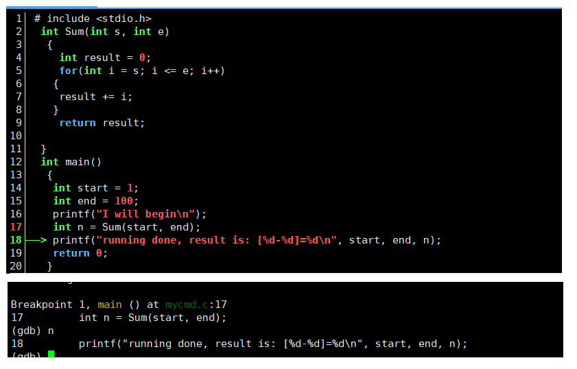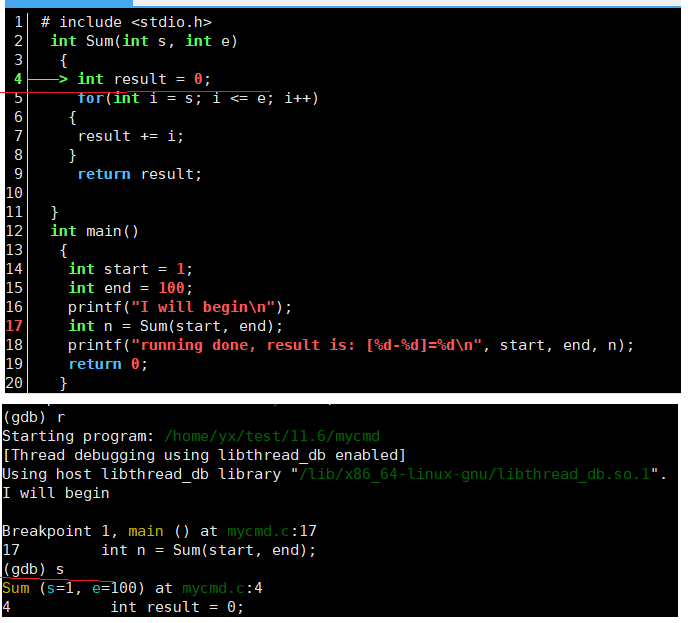 例如 在下面17行打了断点 先r 到了17行 此时输入s就会进入到sum函数当中
