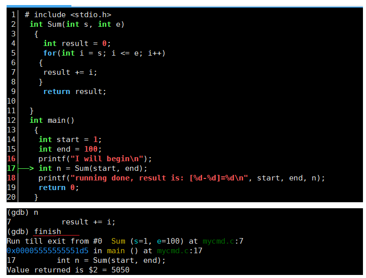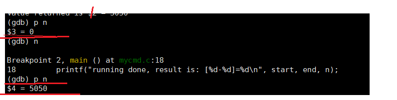 如下 finish结束sum函数后 此时的变量n是0 在用指令n执行当前语句后 此时的n就变成了5050