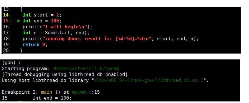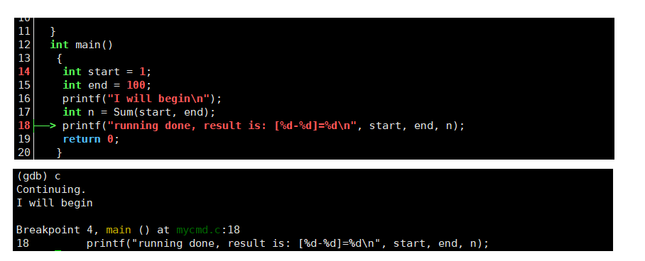 如下 在14行和18行有两个断点 如果从14行开始 此时r会询问是否确认重新从头开始 y的话之后会从头开始然后再次到14行停止 而c会从14行开始运行到下一行断点18行停止