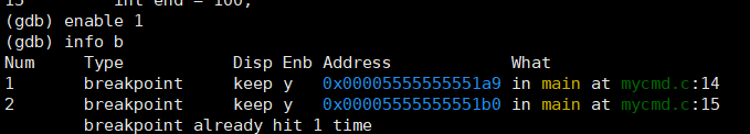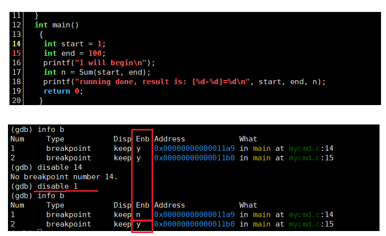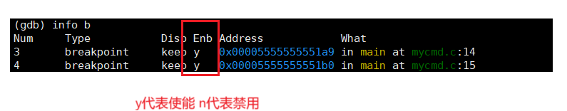 如下 通过info查看断点的时候 Enb的信息如果是y就代表该断点使能 如果是n 就代表该断点禁用