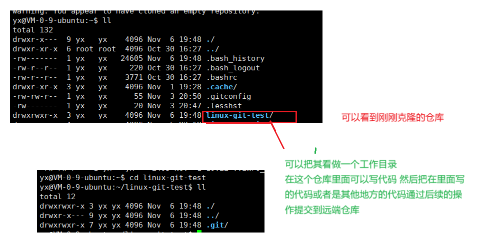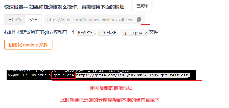 复制仓库链接后 直接在命令行中输入git clone 仓库链接 就会把远端仓库克隆到本地当前目录下
