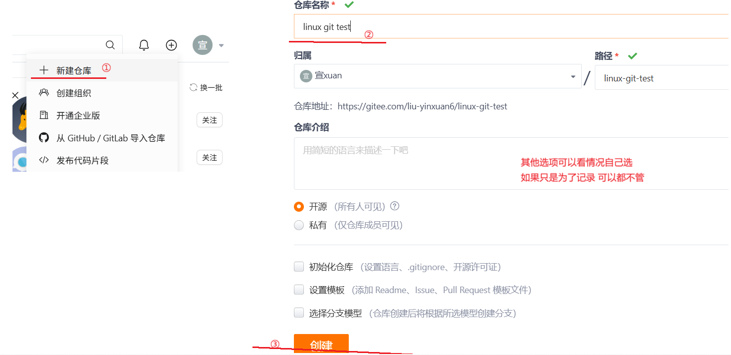 在注册了gitee账号后 右上角新建仓库 输入个仓库名称