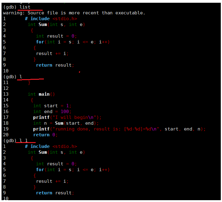 list或者简写l 打印从第一行开始的10行代码 再次输入继续打印接下来的十行