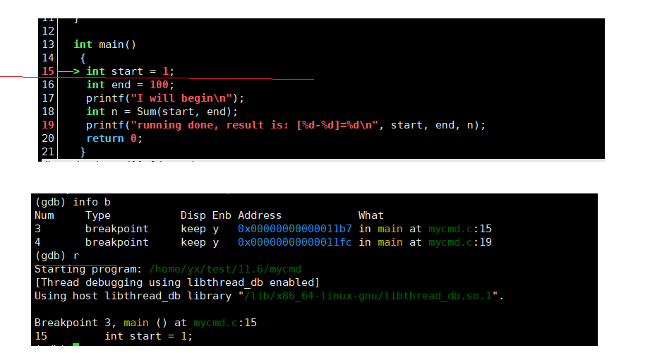 run简写r 如果没有断点 会从程序开始一直执行直到程序结束 如果中间有断点 会从开始运行到第一个断点处 再次r会问是否从开始重新执行