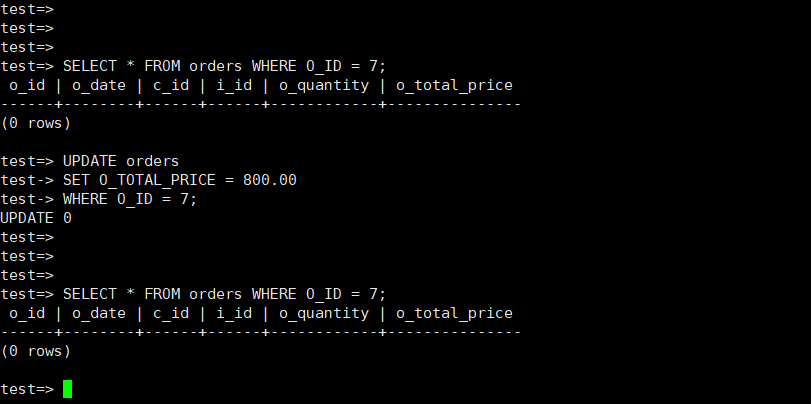 UPDATE orders SET O_TOTAL_PRICE = 800.00 WHERE O_ID = 7;-- 3. 验证更新结果