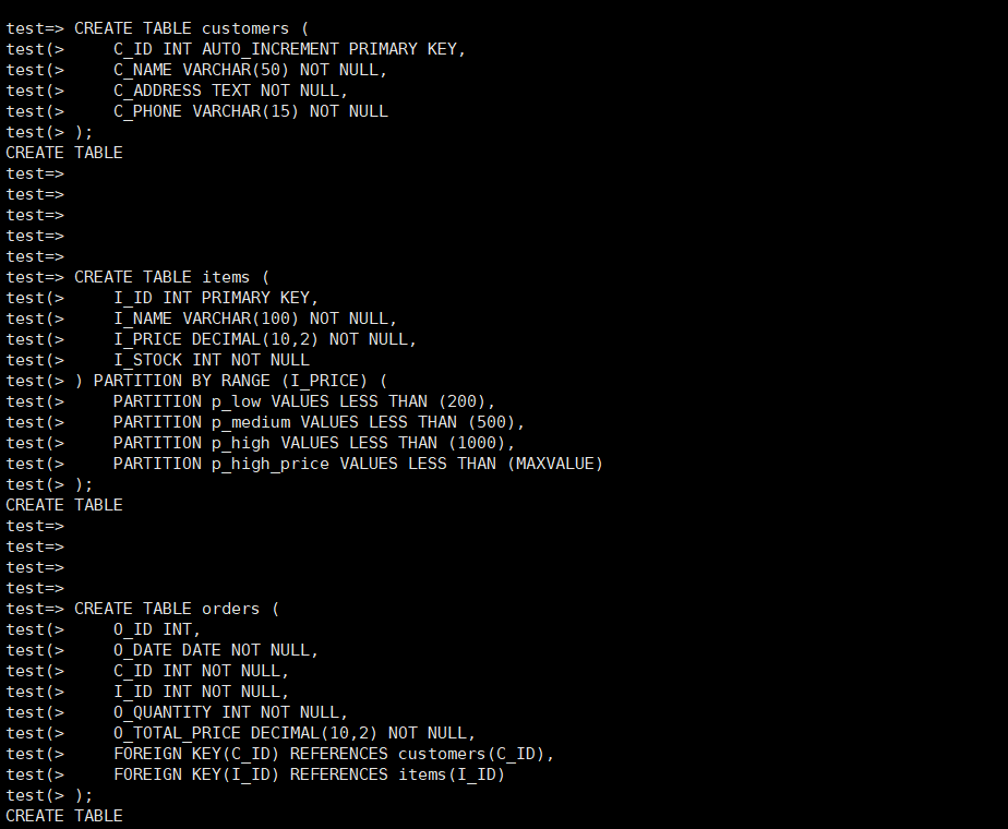 ) PARTITION BY RANGE (I_PRICE) (PARTITION p_low VALUES LESS THAN (200),PARTITION p_medium VALUES LESS THAN (500),PARTITION p_high VALUES LESS THAN (1000),PARTITION p_high_price VALUES LESS THAN (MAXVALUE)