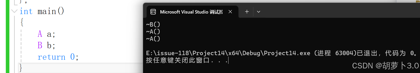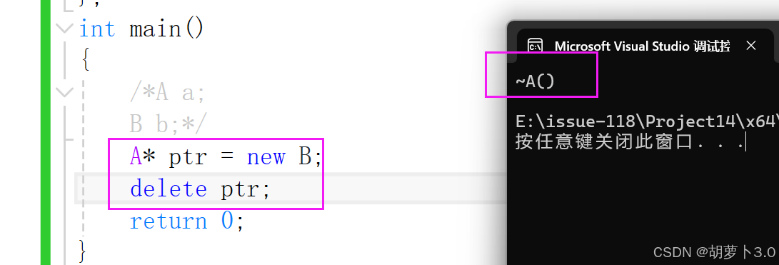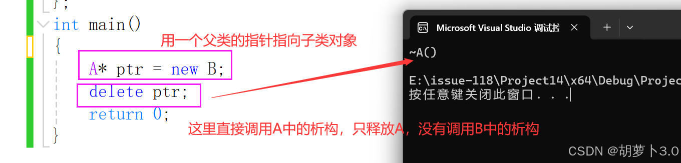但是我这里new的是一个B的对象,应该先调用B中的析构,再调用A中的析构,但是这里直接调用A中的析构函数,只释放A,没有调用B中的析构函数,如果此时B中有资源,就会导致内存泄露问题。