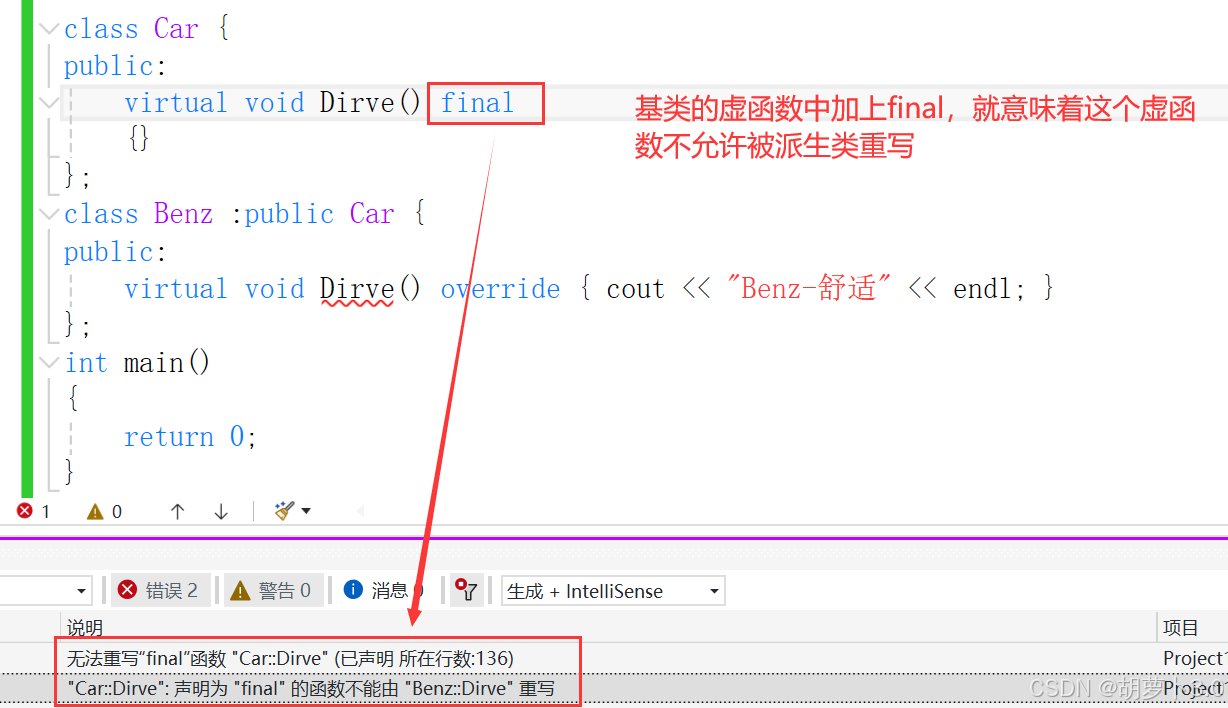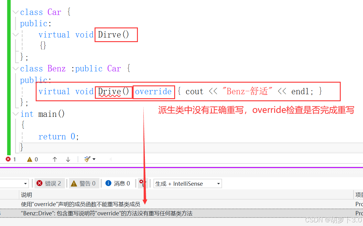 从上面可以看出,C++对虚函数重写的要求比较严格,但是有些情况下由于疏忽,比如函数名写错,参数写错等导致无法构成重写,而这种错误在编译期间是不会爆出的,只有在程序运行时没有得到预期结果才会有报错,这样就得不偿失了