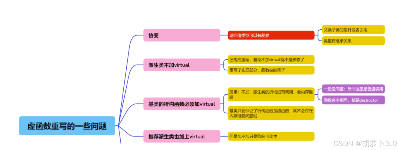 因为如果基类的析构函数不是虚函数,就不构成重写,不构成重写,就是普通调用,就有可能会造成内存泄漏,所以这里必须是多态调用,基类析构函数是虚函数就没有问题