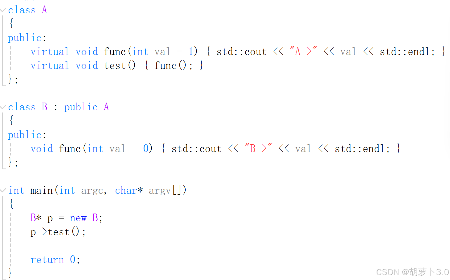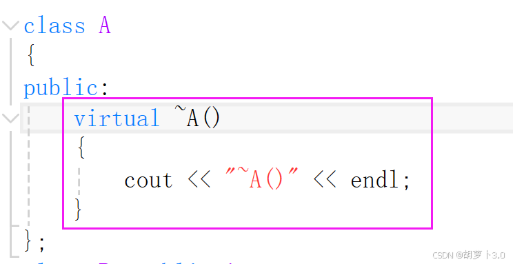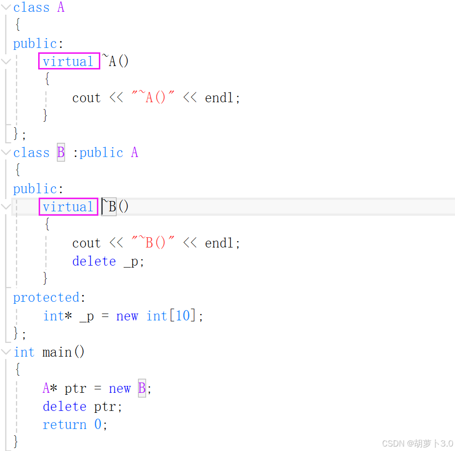 加了virtual ,就是多态调用,多态调用看对象,这里new的是B的对象,会先去调用B的析构,再调用A的析构,这样就不会造成内存泄露问题。