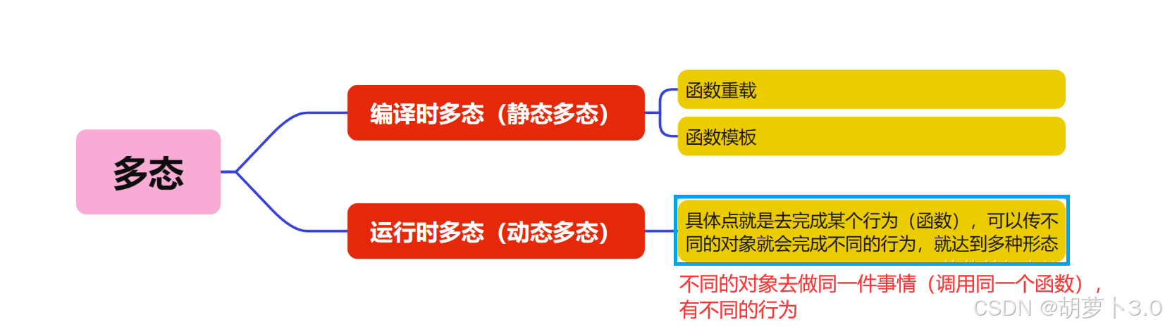 编译时多态:主要是前面我们所讲的函数重载和函数模板,我们通过传不同类型的参数就可以调用不同的函,通过函数参数的不同可以达到多种形态,之所以叫编译时多态,是因为他们实参传给形参的参数匹配是在编译时完成的