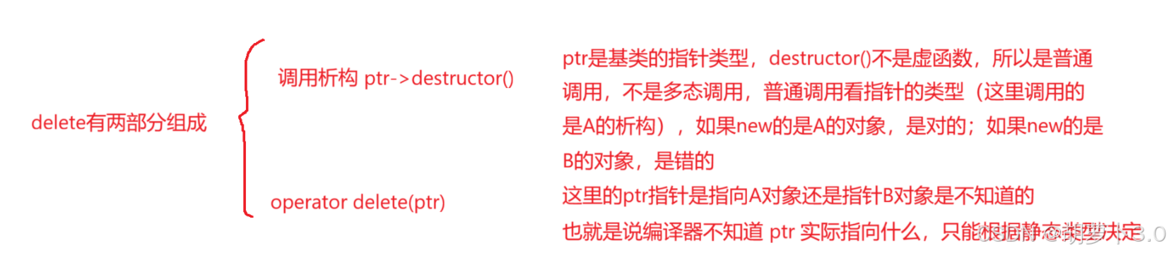 结合上面的场景即可:一个父类的指针指向new出来的派生类对象,然后去delete这个指针
