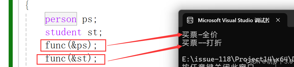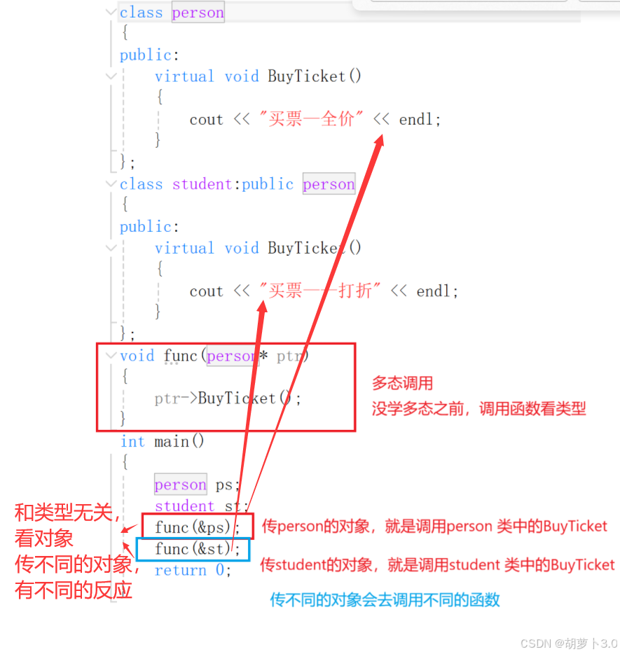 多态是一个继承关系下的类对象,去调用同一函数,产生了不同的行为。就比如上面代码中的student继承了person 。person对象买票全价,student对象优惠买票