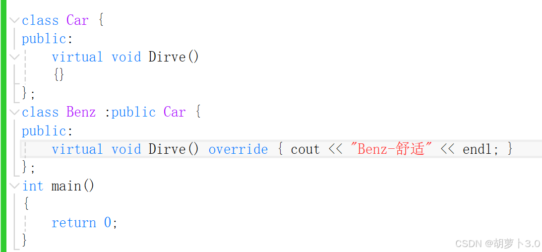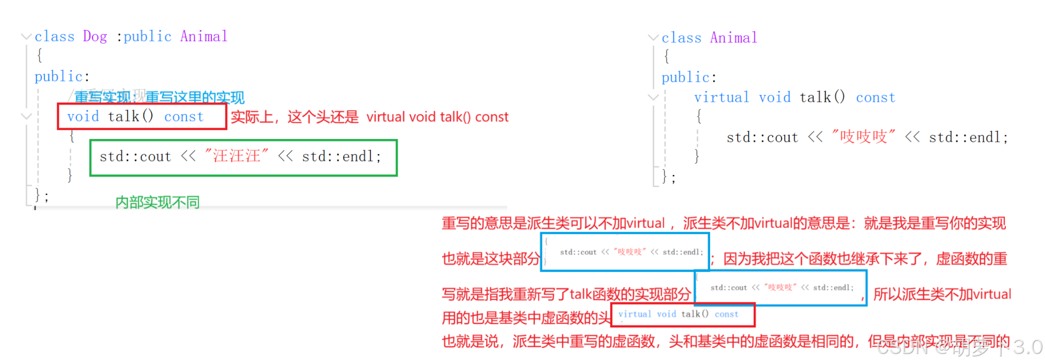 - 第二派生类必须对基类的虚函数完成重写/覆盖,只有完成虚函数的重写/覆盖,基类和派生类之间才能有不同的函数,这样多态的不同形态效果才能达到