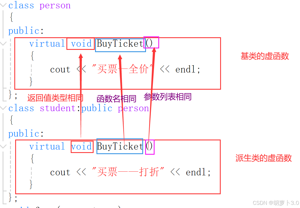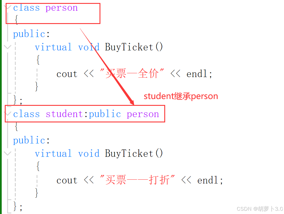 public://BuyTicket函数就是虚函数virtual void BuyTicket(){cout << "买票—全价" << endl;}