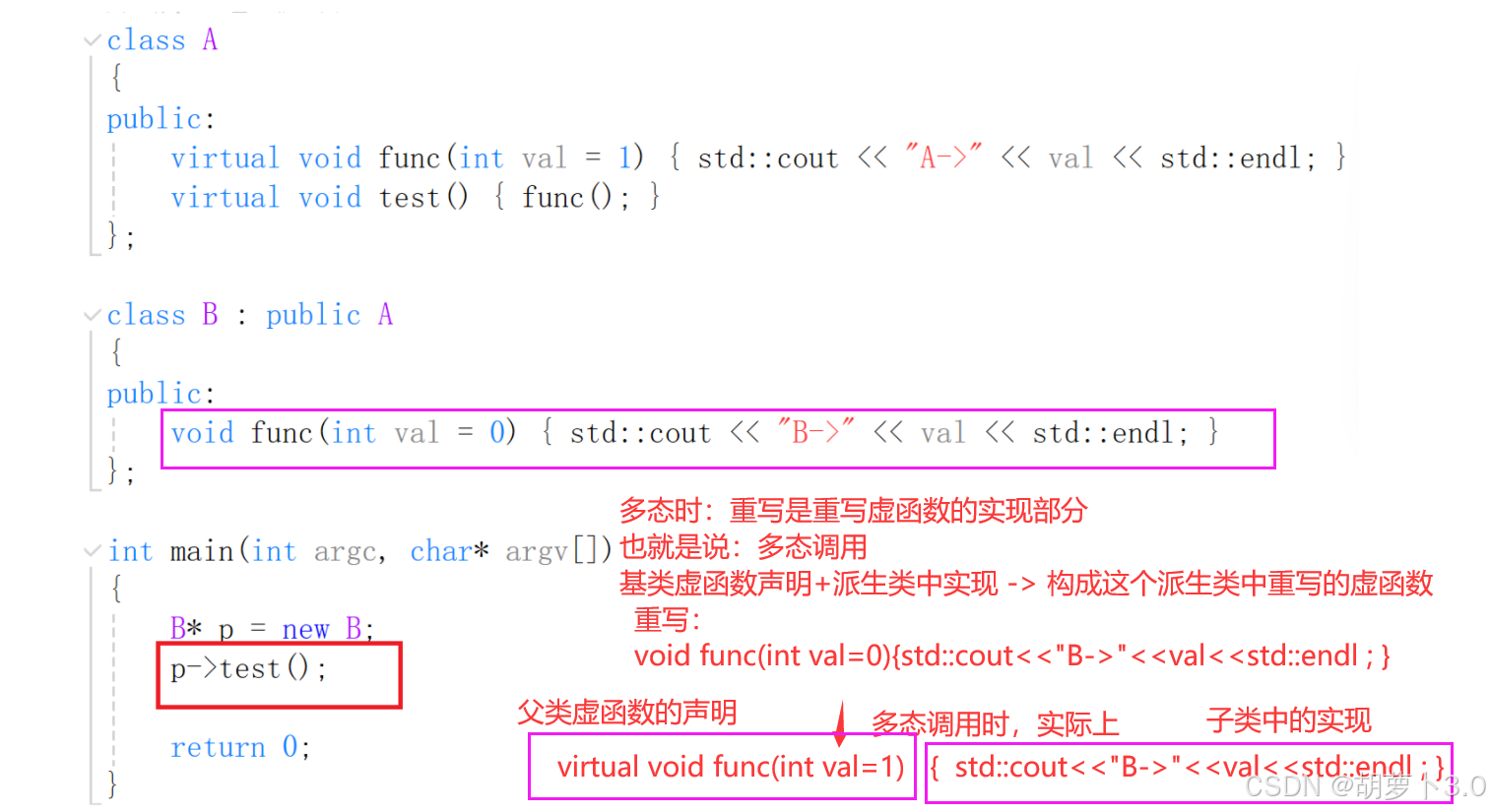 总结:多态调用:父类虚函数声明+子类实现 -> 构成派生类中重写的虚函数