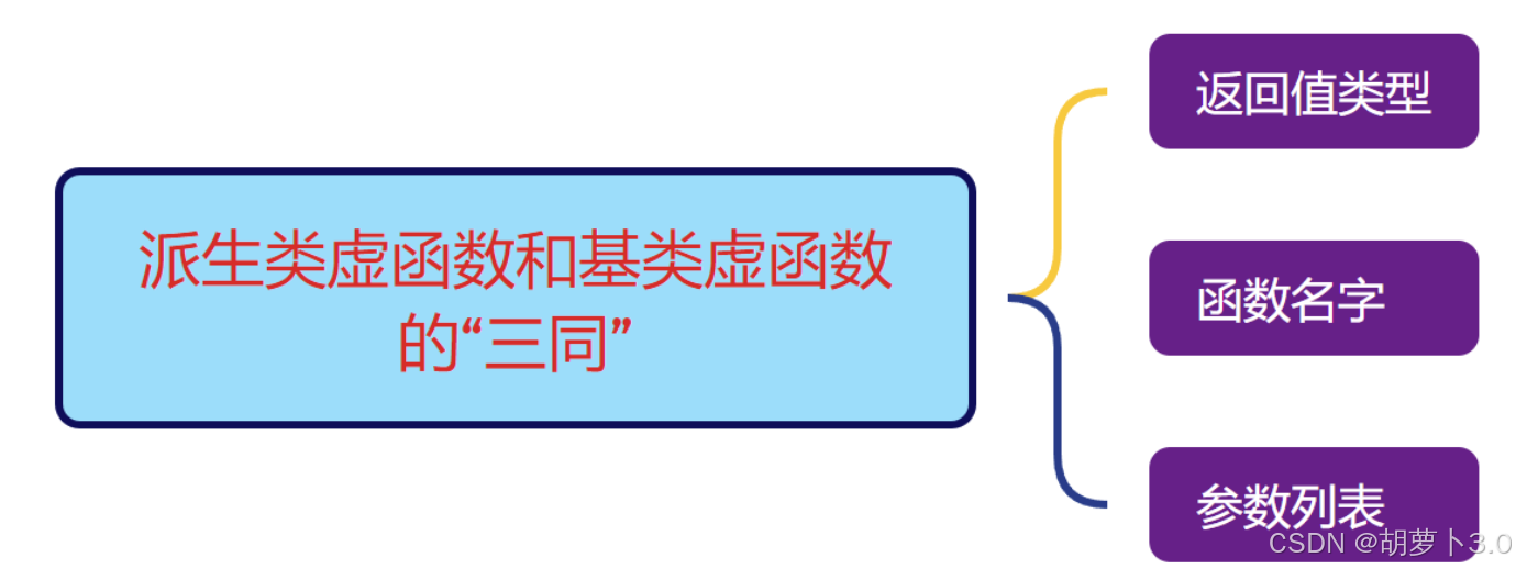 派生类中有一个跟基类完全相同的虚函数(即派生类虚函数与基类虚函数的返回值类型、函数名字、参数列表(参数类型)完全相同),称派生类的虚函数重写了基类的虚函数