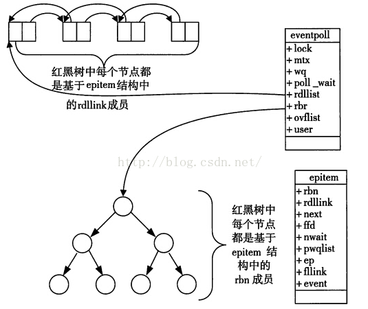 ..../*红⿊树的根节点,这颗树中存储着所有添加到epoll中的需要监控的事件*/struct rb_root rbr;/*双链表中则存放着将要通过epoll_wait返回给⽤户的满⾜条件的事件*/struct list_head rdlist;