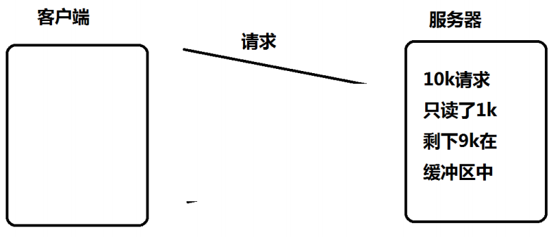 如果服务端写的代码是阻塞式的read, 并且⼀次只 read 1k 数据的话(read不能保证⼀次就把所有的数据都读出来, 参考 man ⼿册的说明, 可能被信号打断), 剩下的9k数据就会待在缓冲区中.
