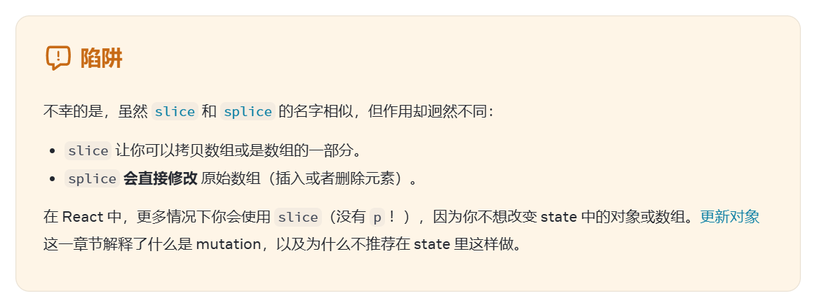 - 不修改原数组,而是返回一个全新的数组(这点对 React state 很重要!)。