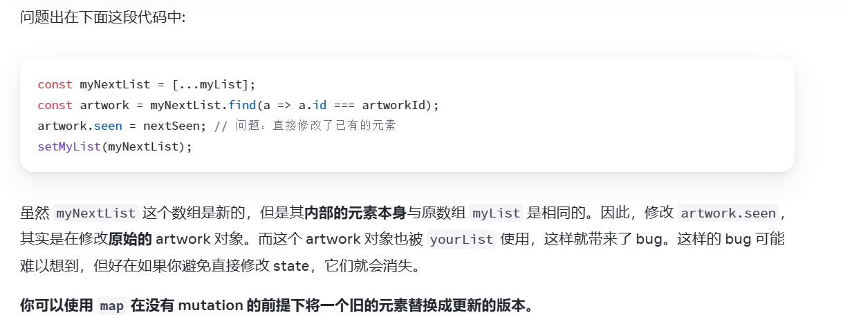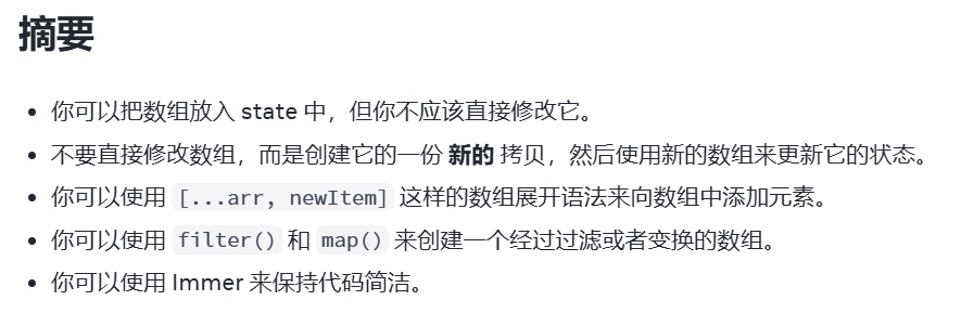 1. “你可以把数组放入 state 中,但你不应该直接修改它。”