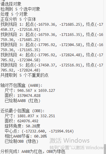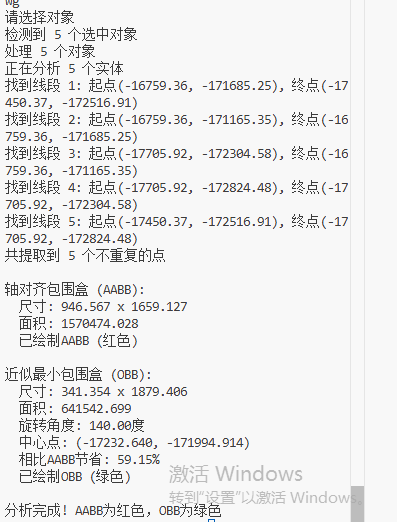 import pyperclipdef get_selection_or_model_space(acad, doc):"""获取用户选择的对象"""print("请选择对象")try:import timeunique_name = f"Temp_Selection_Set_{int(time.time() * 1000) % 10000}"selection_set = doc.SelectionSets.Add(unique_name)selection_set.SelectOnScreen()if selection_set.Count > 0:print(f"检测到 {selection_set.Count} 个选中对象")selection = []for i in range(selection_set.Count):try:entity = selection_set.Item(i)selection.append(entity)except Exception as e:print(f"无法访问选中对象 {i}: {e}")selection_set.Delete()return selectionelse:selection_set.Delete()return []except Exception as e:print(f"无法获取选择集: {e}")return Nonedef get_points_from_entities(entities):"""从AutoCAD实体中提取线段的端点"""points = []for i, entity in enumerate(entities):try:if entity.ObjectName == "AcDbLine":start = entity.StartPoint[:2]end = entity.EndPoint[:2]points.append(tuple(start))points.append(tuple(end))print(f"找到线段 {len(points)//2}: 起点({start[0]:.2f}, {start[1]:.2f}), 终点({end[0]:.2f}, {end[1]:.2f})")else:print(f"跳过非线段对象 {i+1}: {entity.ObjectName}")except Exception as e:print(f"处理对象 {i+1} 时出错: {e}")continuepoints = list(set(points))print(f"共提取到 {len(points)} 个不重复的点")return pointsdef get_aabb_bounding_box(points):"""获取轴对齐的最小包围矩形"""if len(points) < 1:return Nonex_coords = [p[0] for p in points]y_coords = [p[1] for p in points]min_x, max_x = min(x_coords), max(x_coords)min_y, max_y = min(y_coords), max(y_coords)width = max_x - min_xheight = max_y - min_y# 计算四个角点corners = [(min_x, min_y),(max_x, min_y),(max_x, max_y),(min_x, max_y)]return {'type': 'AABB','corners': corners,'width': width,'height': height,'area': width * height,'angle': 0,'center': ((min_x + max_x) / 2, (min_y + max_y) / 2)}def rotate_point(point, angle, center=(0, 0)):"""绕指定中心点旋转点"""x, y = pointcx, cy = centerx -= cxy -= cyrad = math.radians(angle)cos_rad, sin_rad = math.cos(rad), math.sin(rad)new_x = x * cos_rad - y * sin_radnew_y = x * sin_rad + y * cos_radnew_x += cxnew_y += cyreturn (new_x, new_y)def get_bounding_box_area(points, angle):"""计算给定角度下的包围盒面积和边界信息"""rotated_points = [rotate_point(p, -angle) for p in points]x_coords = [p[0] for p in rotated_points]y_coords = [p[1] for p in rotated_points]min_x, max_x = min(x_coords), max(x_coords)min_y, max_y = min(y_coords), max(y_coords)width = max_x - min_xheight = max_y - min_yarea = width * heightreturn area, (min_x, max_x, min_y, max_y)def ternary_search_min_area(points, left, right, eps=1e-6):"""使用三分法搜索最小面积角度"""while right - left > eps:mid1 = left + (right - left) / 3mid2 = right - (right - left) / 3area1, _ = get_bounding_box_area(points, mid1)area2, _ = get_bounding_box_area(points, mid2)if area1 < area2:right = mid2else:left = mid1optimal_angle = (left + right) / 2min_area, bounds = get_bounding_box_area(points, optimal_angle)return optimal_angle, min_area, boundsdef get_oriented_bounding_box_approx(points):"""使用三分搜索获取最小面积包围矩形"""if len(points) < 2:return None# 首先找到一个较好的初始角度范围angles_to_check = []# 使用较小步长进行初步搜索for i in range(0, 180, 2):angles_to_check.append(i)# 找到距离最远的点对max_dist = 0farthest_pair = Nonefor i in range(len(points)):for j in range(i+1, len(points)):dist = math.sqrt((points[i][0]-points[j][0])**2 + (points[i][1]-points[j][1])**2)if dist > max_dist:max_dist = distfarthest_pair = (points[i], points[j])if farthest_pair:p1, p2 = farthest_pairangle = math.degrees(math.atan2(p2[1] - p1[1], p2[0] - p1[0]))angles_to_check.extend([angle, angle + 90])angles_to_check = list(set([a % 180 for a in angles_to_check]))# 找到初步的最小面积角度min_area = float('inf')best_angle = 0best_bounds = Nonefor angle in angles_to_check:area, bounds = get_bounding_box_area(points, angle)if area < min_area:min_area = areabest_angle = anglebest_bounds = bounds# 在最优角度附近使用三分法进行精细搜索search_range = 5 # 搜索范围±5度left_angle = (best_angle - search_range) % 180right_angle = (best_angle + search_range) % 180# 处理跨越0度的情况if left_angle > right_angle:# 在[0, right_angle]和[left_angle, 180]两个区间分别搜索optimal_angle1, min_area1, bounds1 = ternary_search_min_area(points, 0, right_angle)optimal_angle2, min_area2, bounds2 = ternary_search_min_area(points, left_angle, 180)if min_area1 < min_area2:optimal_angle = optimal_angle1min_area = min_area1best_bounds = bounds1else:optimal_angle = optimal_angle2min_area = min_area2best_bounds = bounds2else:optimal_angle, min_area, best_bounds = ternary_search_min_area(points, left_angle, right_angle)# 构造最终的包围盒min_x, max_x, min_y, max_y = best_boundswidth = max_x - min_xheight = max_y - min_y# 计算旋转后的四个角点rotated_corners = [(min_x, min_y),(max_x, min_y),(max_x, max_y),(min_x, max_y)]# 将角点旋转回原始坐标系corners = [rotate_point(p, optimal_angle) for p in rotated_corners]center_x = (min_x + max_x) / 2center_y = (min_y + max_y) / 2center_original = rotate_point((center_x, center_y), optimal_angle)return {'type': 'OBB','corners': corners,'width': width,'height': height,'area': min_area,'angle': optimal_angle,'center': center_original}def draw_bounding_box(acad, box, color_index):"""在AutoCAD中绘制包围框:param acad: Autocad实例:param box: 包围框字典,包含corners列表:param color_index: AutoCAD颜色索引 (1=红色, 3=绿色, 5=蓝色等)"""if not box or 'corners' not in box:return Nonecorners = box['corners']model = acad.model# 绘制四条边,形成闭合矩形lines = []for i in range(4):p1 = APoint(corners[i][0], corners[i][1], 0)p2 = APoint(corners[(i+1)%4][0], corners[(i+1)%4][1], 0)line = model.AddLine(p1, p2)line.Color = color_indexlines.append(line)return linesdef analyze_and_draw_bounding_boxes(acad