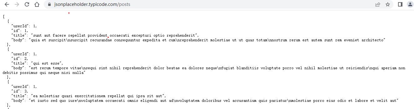 import requestsresponse = requests.get('https://jsonplaceholder.typicode.com/posts') # 返回格式为JSON,其中data里面对应数组