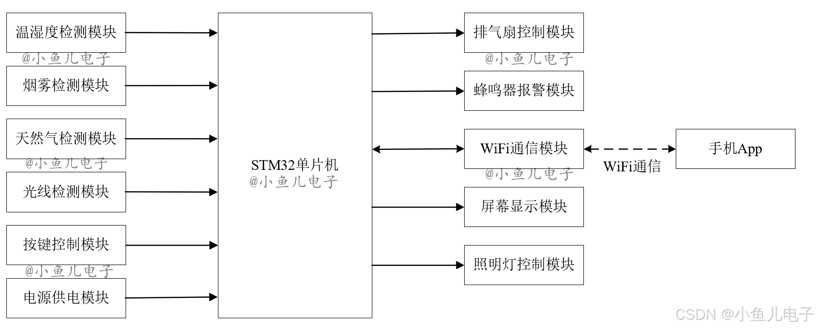 基于单片机的多功能油烟机控制系统能够根据厨房的烟雾浓度程度来自动调节排风机的挡位,进而实现资源的节约,并保留传统的手动控制油烟机排风扇挡位的功能,在此基础上,系统设计了环境的温湿度检测、天然气泄漏检测和环境灯光监测与控制功能。采用STM32单片机作为微处理器,通过温湿度检测模块、烟雾检测模块、天然气检测模块和光线检测模块实现对环境温度、湿度、天然气浓度、烟雾浓度和光线等数据的实时监测,能够联动排风扇和照明灯进行自动化调节来改善环境状况,再通过单片机的通信接口进行数据获取与存储后,通过OLED显示屏进行数据可视化,并通过WiFi无线通信技术将监测数据发送至手机App,进而实现数据查看、阈值设定和设备控制。
