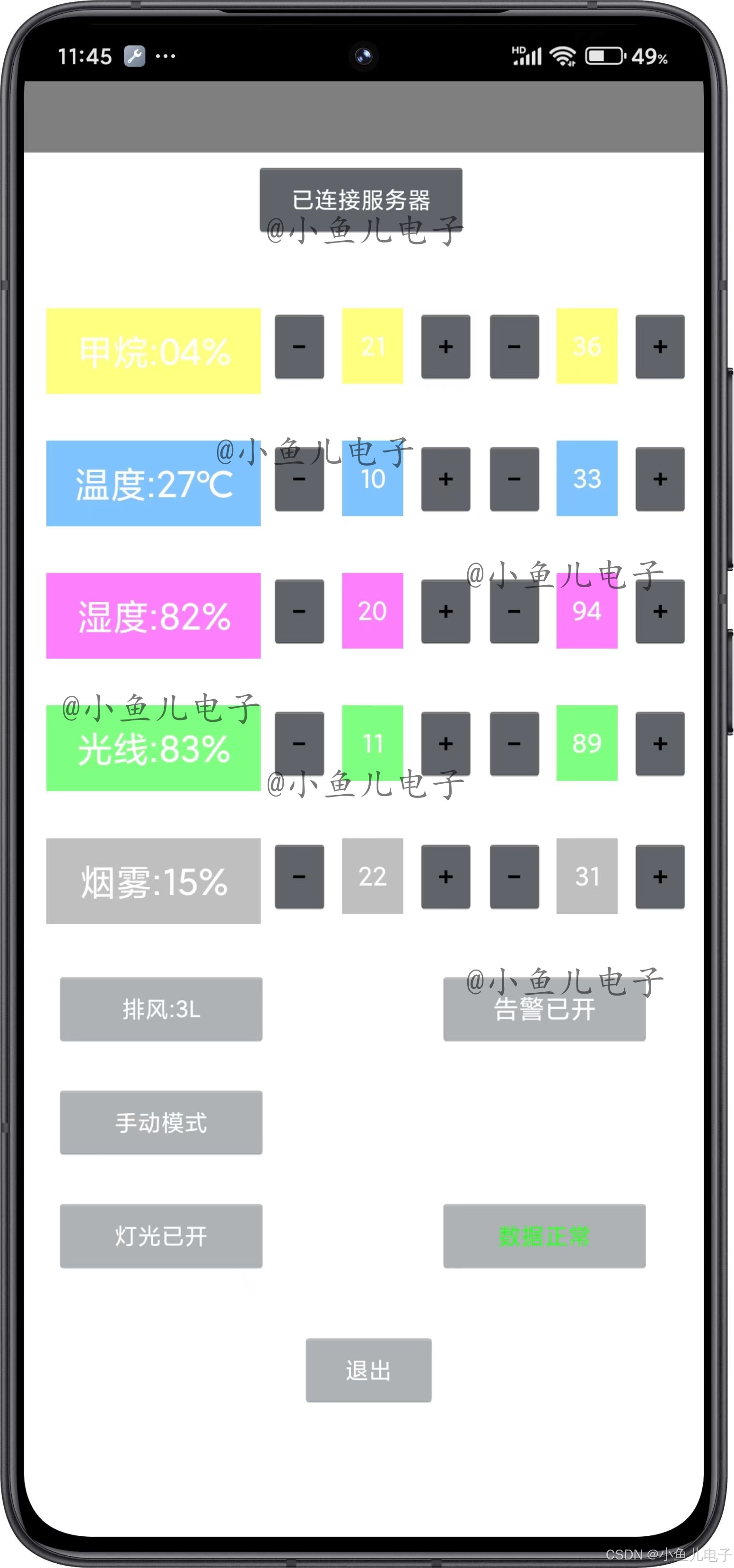 8、手机App监测与控制:通过WiFi无线通信技术将监测数据发送至手机App,用户可以通过手机App查看厨房环境数据、阈值设定和设备控制。