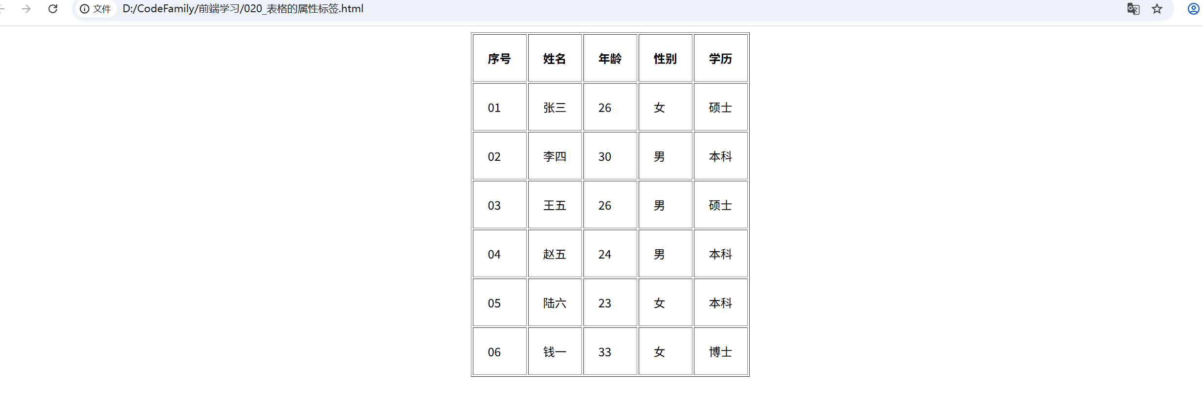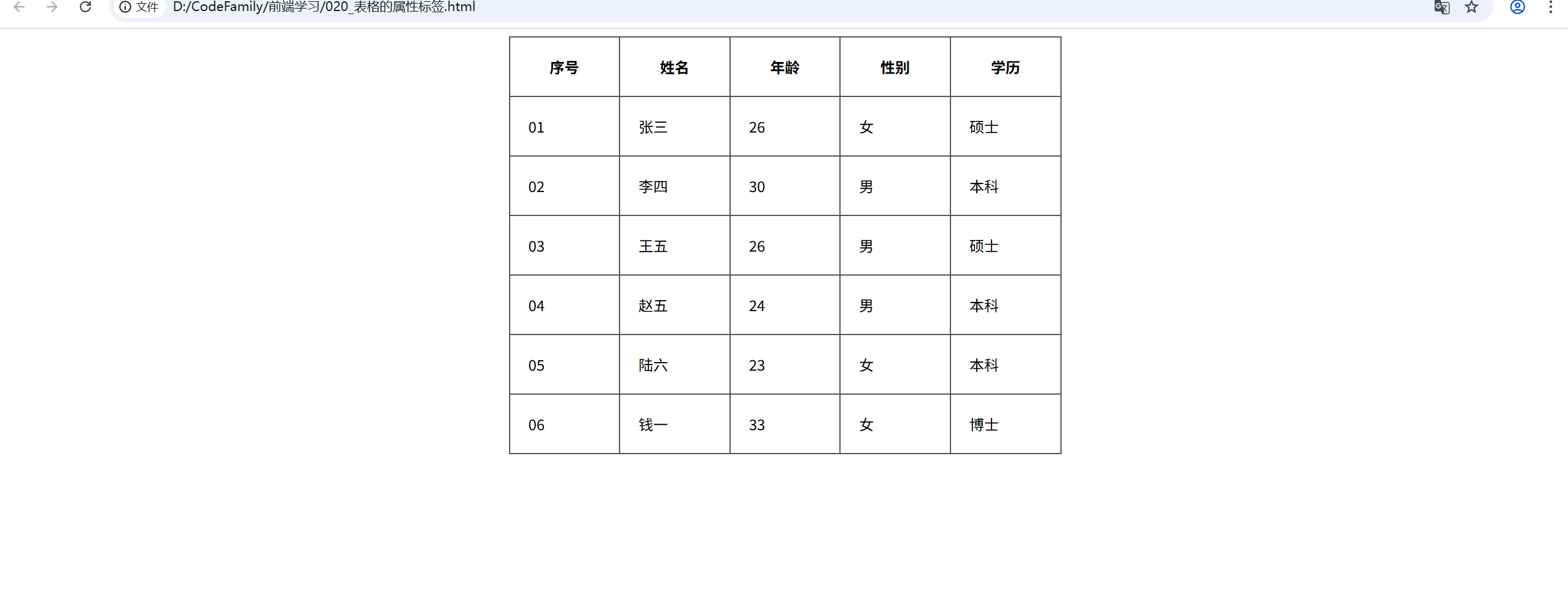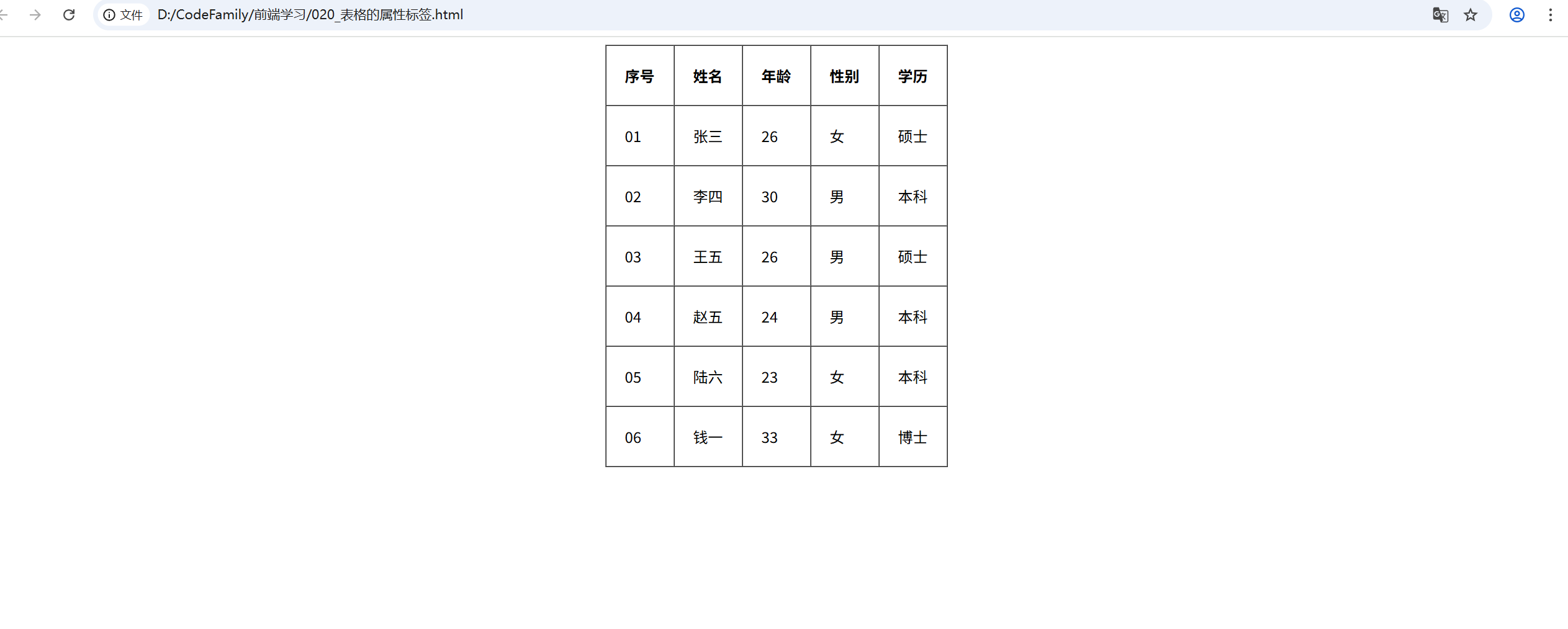 </head><body><table><tr><td>序号</td><td>姓名</td><td>年龄</td><td>性别</td><td>学历</td></tr><tr><td>01</td><td>张三</td><td>26</td><td>女</td><td>硕士</td></tr><tr><td>02</td><td>李四</td><td>30</td><td>男</td><td>本科</td></tr><tr><td>03</td><td>王五</td><td>26</td><td>男</td><td>硕士</td></tr><tr><td>04</td><td>赵五</td><td>24</td><td>男</td><td>本科</td></tr><tr><td>05</td><td>陆六</td><td>23</td><td>女</td><td>本科</td></tr><tr><td>06</td><td>钱一</td><td>33</td><td>女</td><td>博士</td></tr></table>