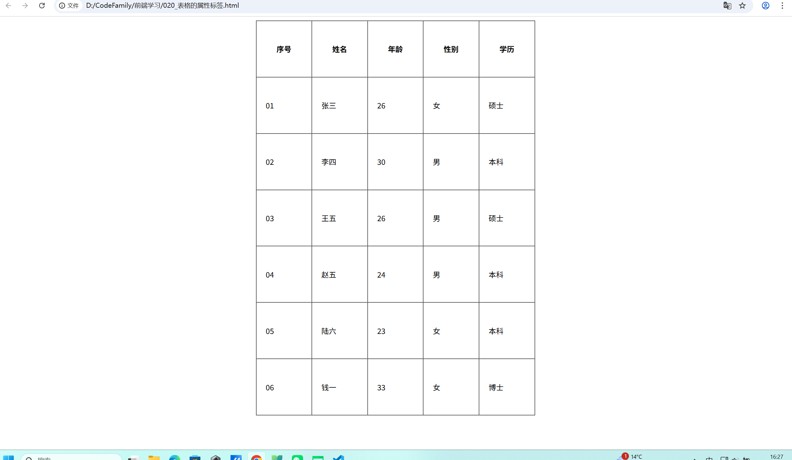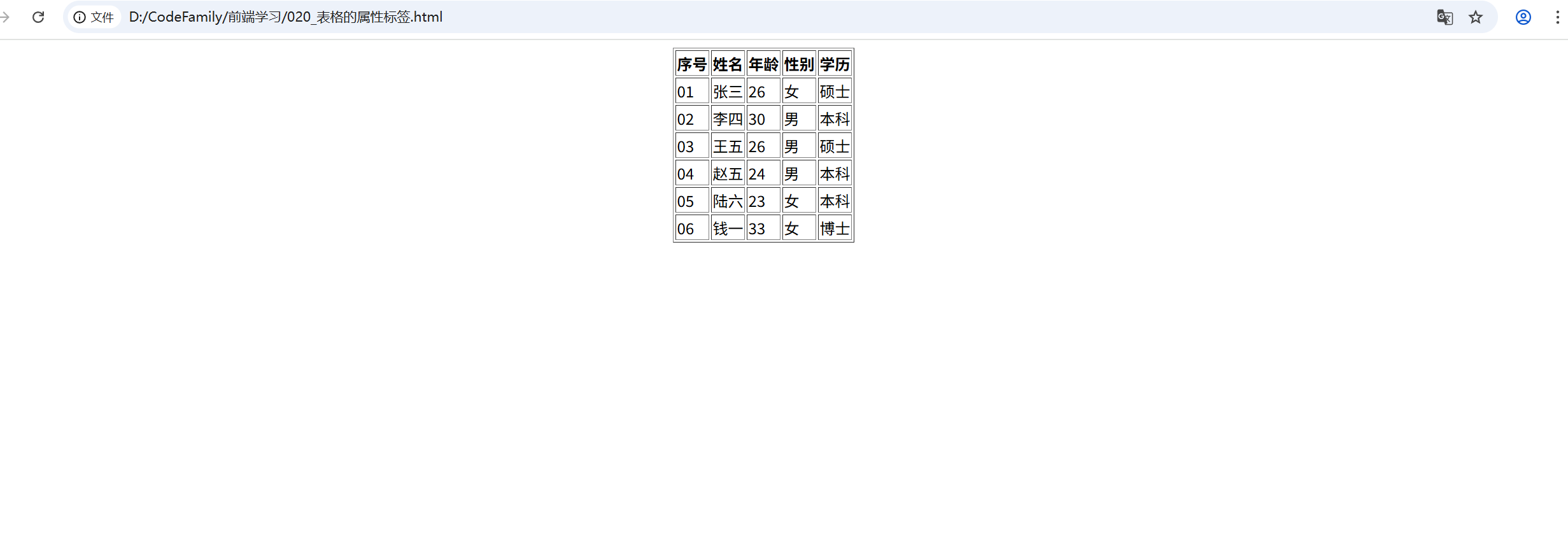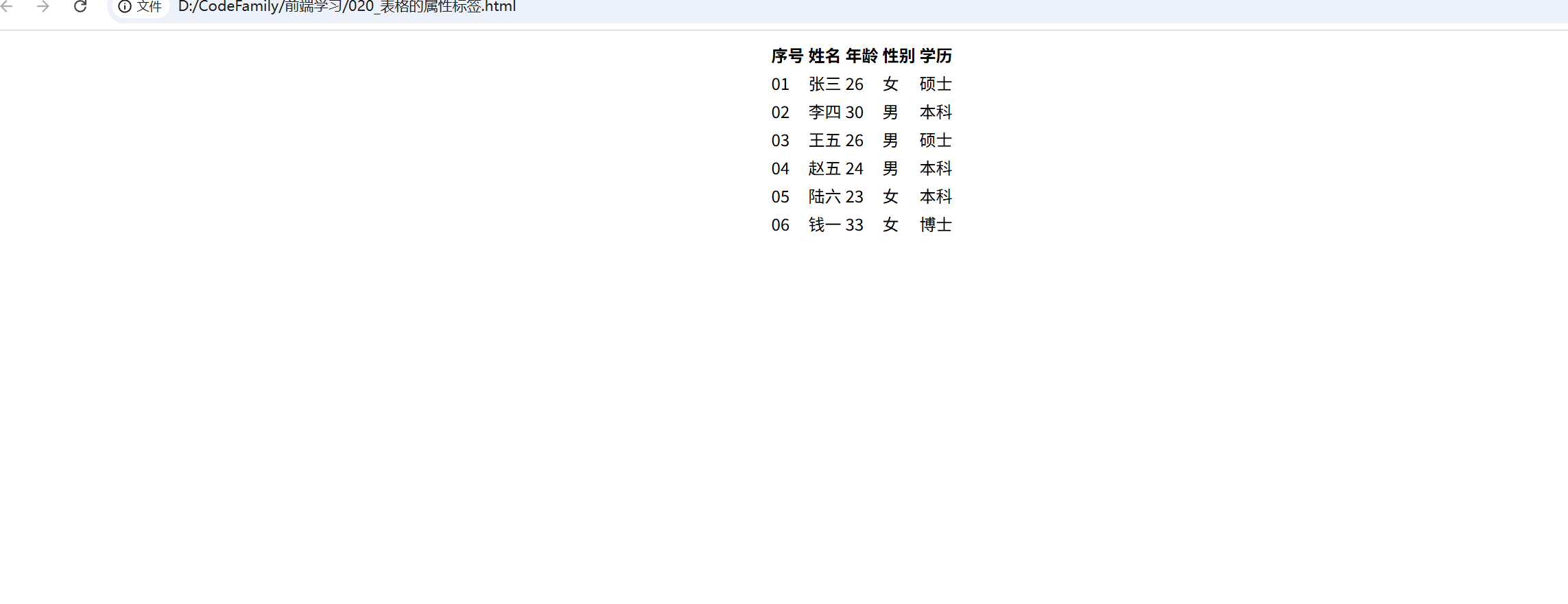 </head><body><table><tr><td>序号</td><td>姓名</td><td>年龄</td><td>性别</td><td>学历</td></tr><tr><td>01</td><td>张三</td><td>26</td><td>女</td><td>硕士</td></tr><tr><td>02</td><td>李四</td><td>30</td><td>男</td><td>本科</td></tr><tr><td>03</td><td>王五</td><td>26</td><td>男</td><td>硕士</td></tr><tr><td>04</td><td>赵五</td><td>24</td><td>男</td><td>本科</td></tr><tr><td>05</td><td>陆六</td><td>23</td><td>女</td><td>本科</td></tr><tr><td>06</td><td>钱一</td><td>33</td><td>女</td><td>博士</td></tr></table>