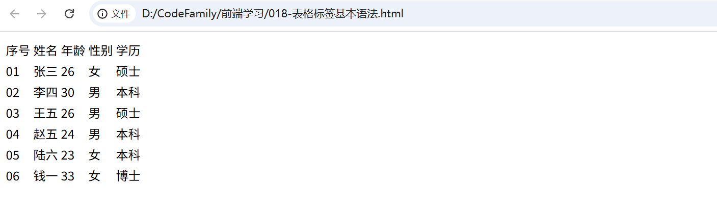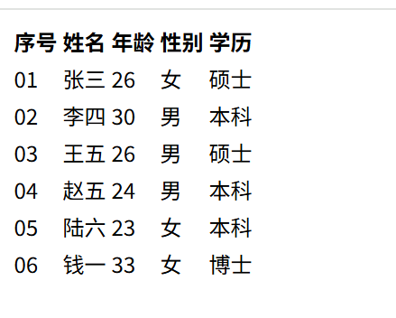 <tr><th>序号</th><th>姓名</th><th>年龄</th><th>性别</th><th>学历</th></tr>效果: