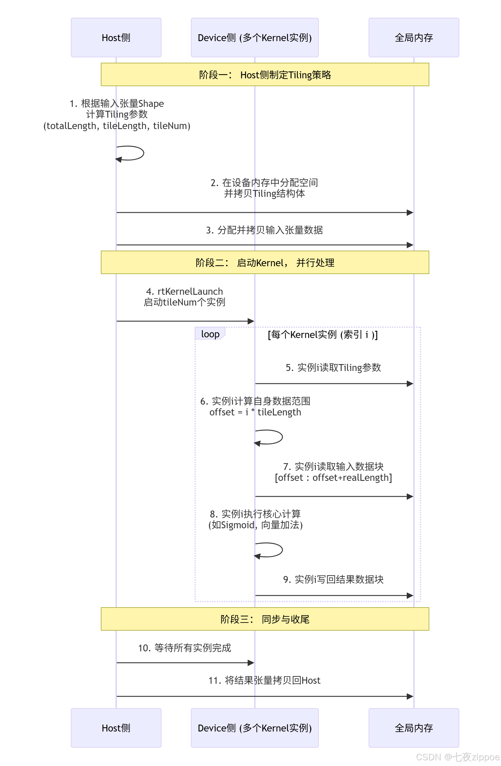 素材中将 “算子工程——Host侧实现Tiling函数实现”和 “算子工程——Kernel侧使用Tiling信息”作为独立且关键的环节,这凸显了 Tiling 是实现任务并行的桥梁。下面我们通过一个详细的序列图来展示 Host 与 Device 如何围绕 Tiling 进行协作: