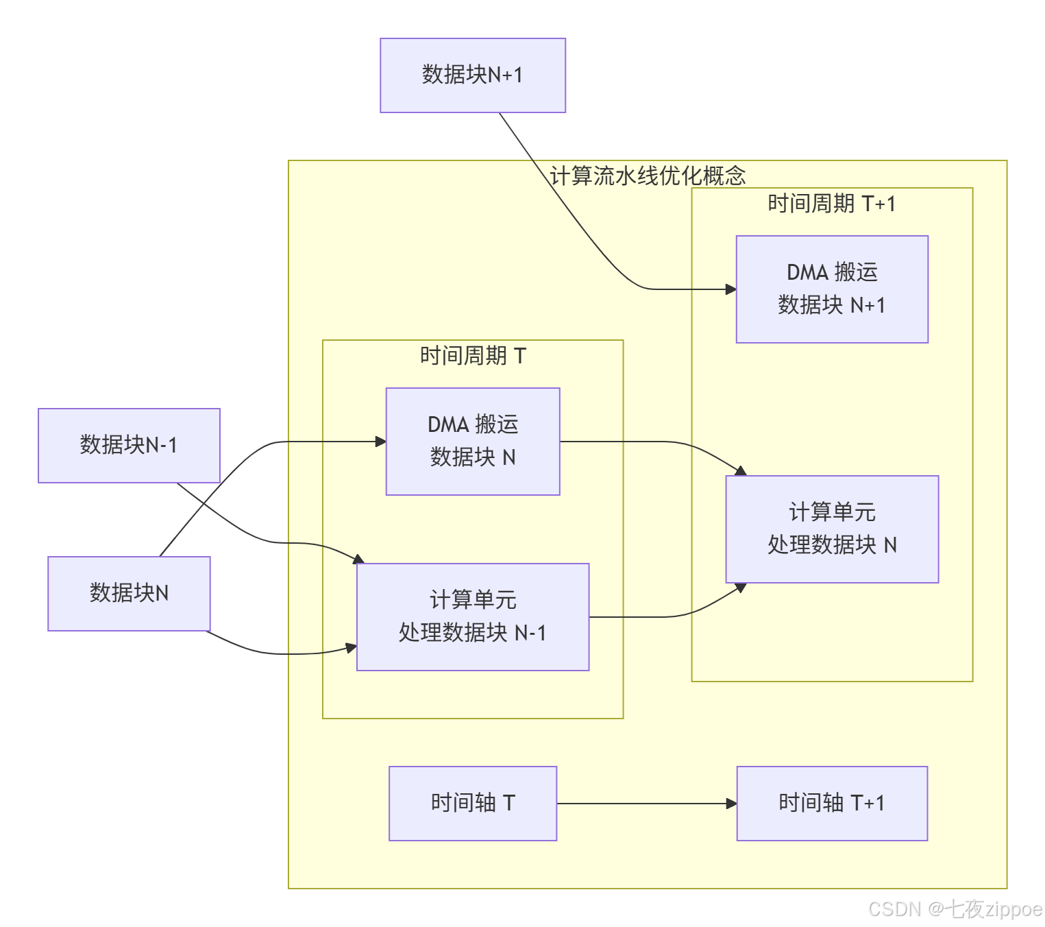 这种“全局内存->UB->计算->全局内存”的操作是性能优化的基础。但更高级的优化是让第1步和第2步重叠执行,即流水线(Pipeline)优化。