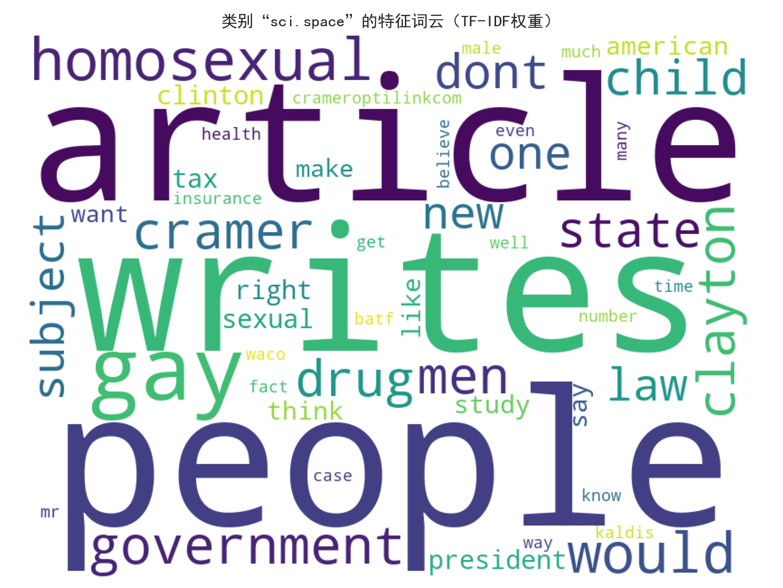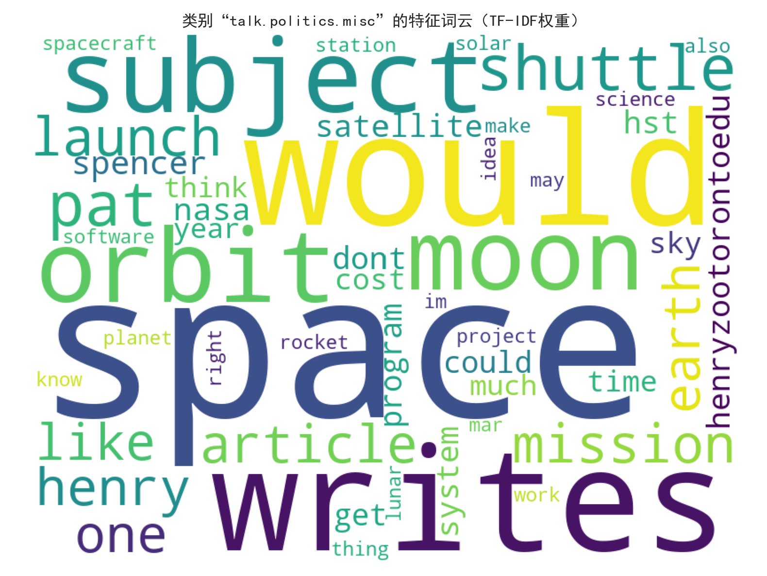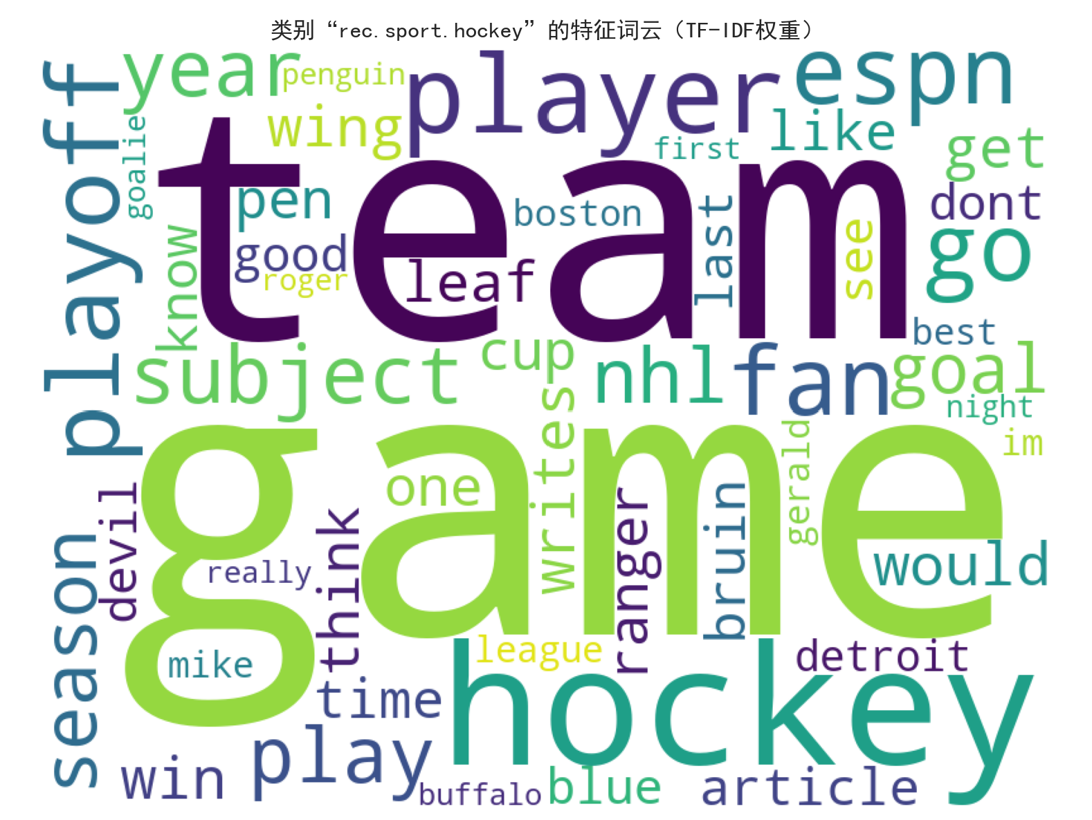 rec.sport.hockey(冰球类):核心特征词集中于hockey(冰球)、team(球队)、league(联盟)、NHL(国家冰球联盟)、player(球员)等,完全贴合冰球运动主题。talk.politics.misc(政治类):核心特征词包括government(政府)、president(总统)、law(法律)、people(民众)等,精准反映政治领域讨论焦点。sci.space(太空类):虽文档中词云描述存在部分字符乱码,但核心语义特征仍围绕太空探索相关主题,与其他两类形成明确区分。