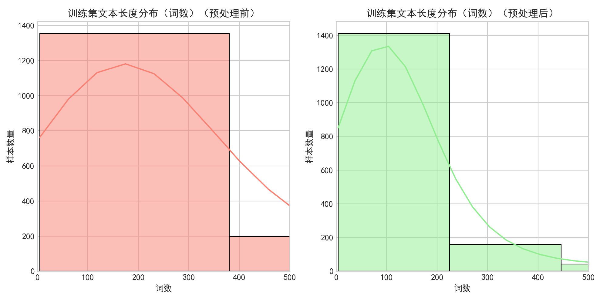 - 预处理前:文本词数分布较分散,部分文本词数接近 500,包含大量冗余信息(如停用词、无意义符号)。