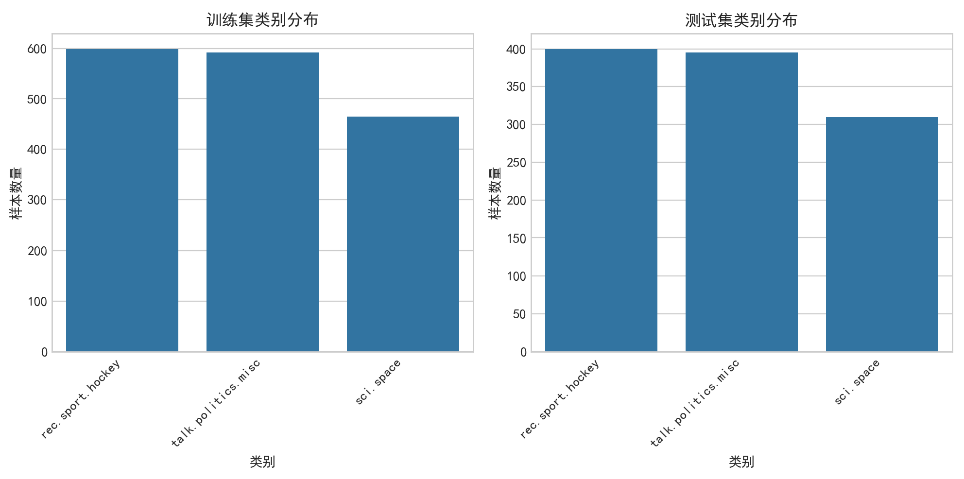 - 类别分布:从类别分布图可见,三个类别在训练集和测试集中的样本数量相对均衡 —— 训练集中冰球类、政治类、太空类样本数量接近,测试集分别为 400 条、395 条、310 条,无严重类别偏斜。这种均衡分布避免了模型对多数类的过度拟合,为公平评估模型泛化能力提供了基础。