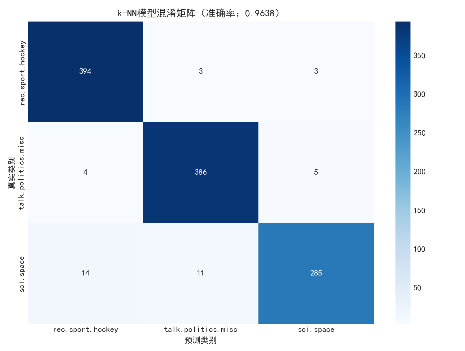 混淆矩阵结果表明,k-NN 算法基于余弦相似度的近邻投票机制能有效区分三个类别的文本,验证了特征提取和参数调优的有效性。