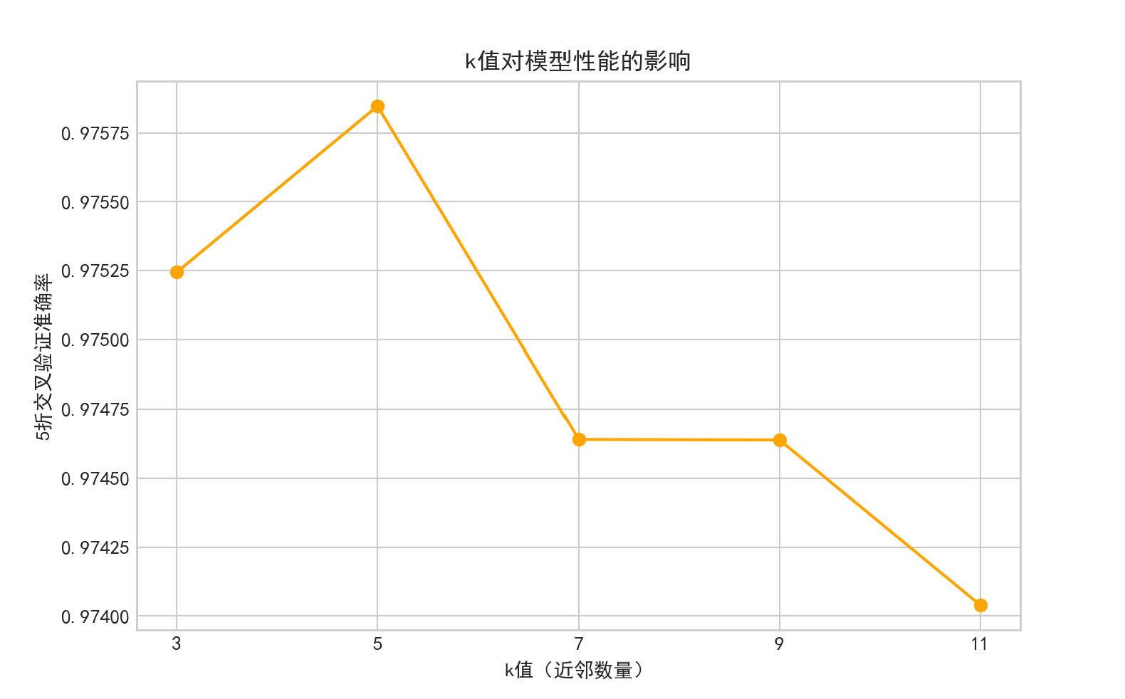 - 最优 k 值:5,对应交叉验证准确率达 0.9758,为所有候选值中的最高值。