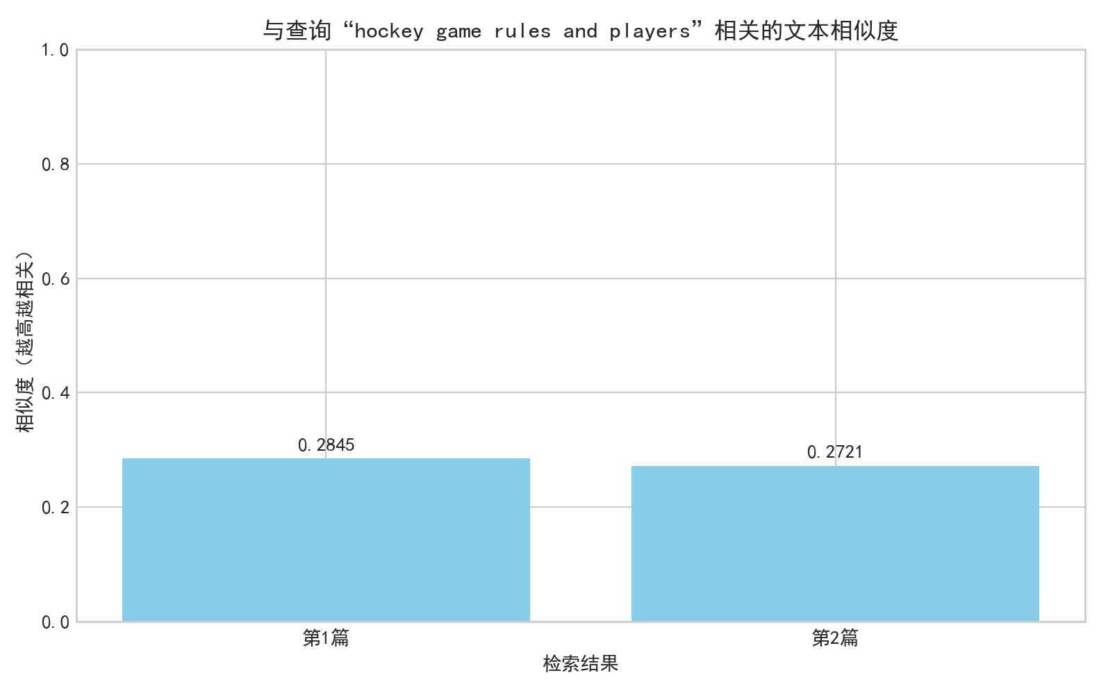 rec.sport.hockey(冰球类),类别匹配准确率 100%,无跨类别误检索。 - 内容相关性:第一篇文本讨论 NHL 球员行为规范,第二篇涉及 ESPN 冰球赛事转播,均与查询中的 “冰球比赛”“球员” 核心主题高度相关,表明 TF-IDF 向量能有效捕捉文本语义相似性。