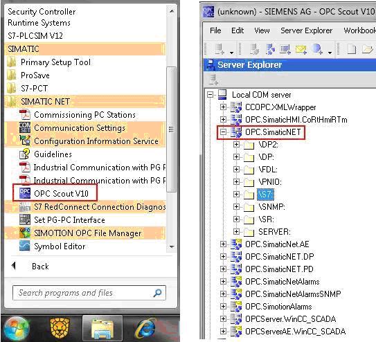 计算机开始菜单,执 行SIMATIC NET的 OPC Scout V10 打开“Server Explorer”。